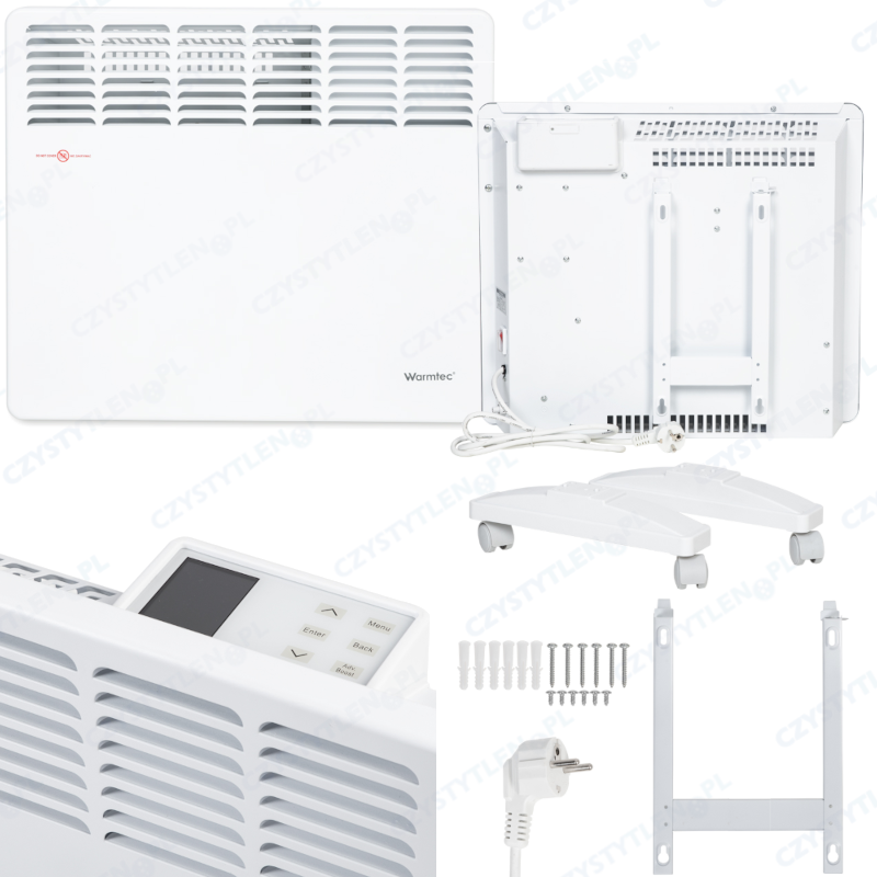 W zestawie z grzejnikiem znajdują się: uchwyty ścienne wraz z wszystkimi śrubami montażowymi oraz nóżki. Grzejnik podłączany jest do prądu za pomocą kabla zakończonego wtyczką