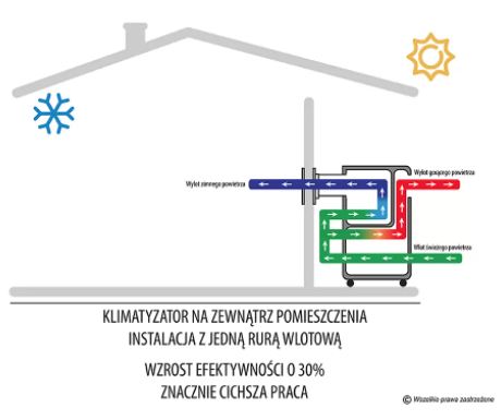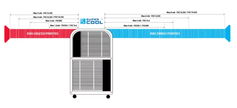 - Przedłużenie rury wylotowej do 6 m (opcja) pozwala na swobodne dostarczanie schłodzonego powietrza do dowolnych pomieszczeń.
