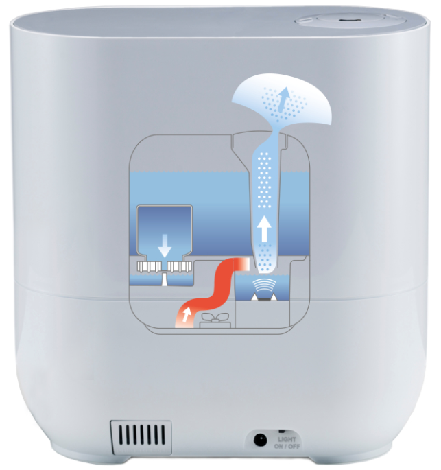 Dzięki efektywnej technologii wysokiej częstotliwości woda jest przekształcana w drobną mgiełkę i wypuszczana do powietrza w pomieszczeniu za pomocą wentylatora.