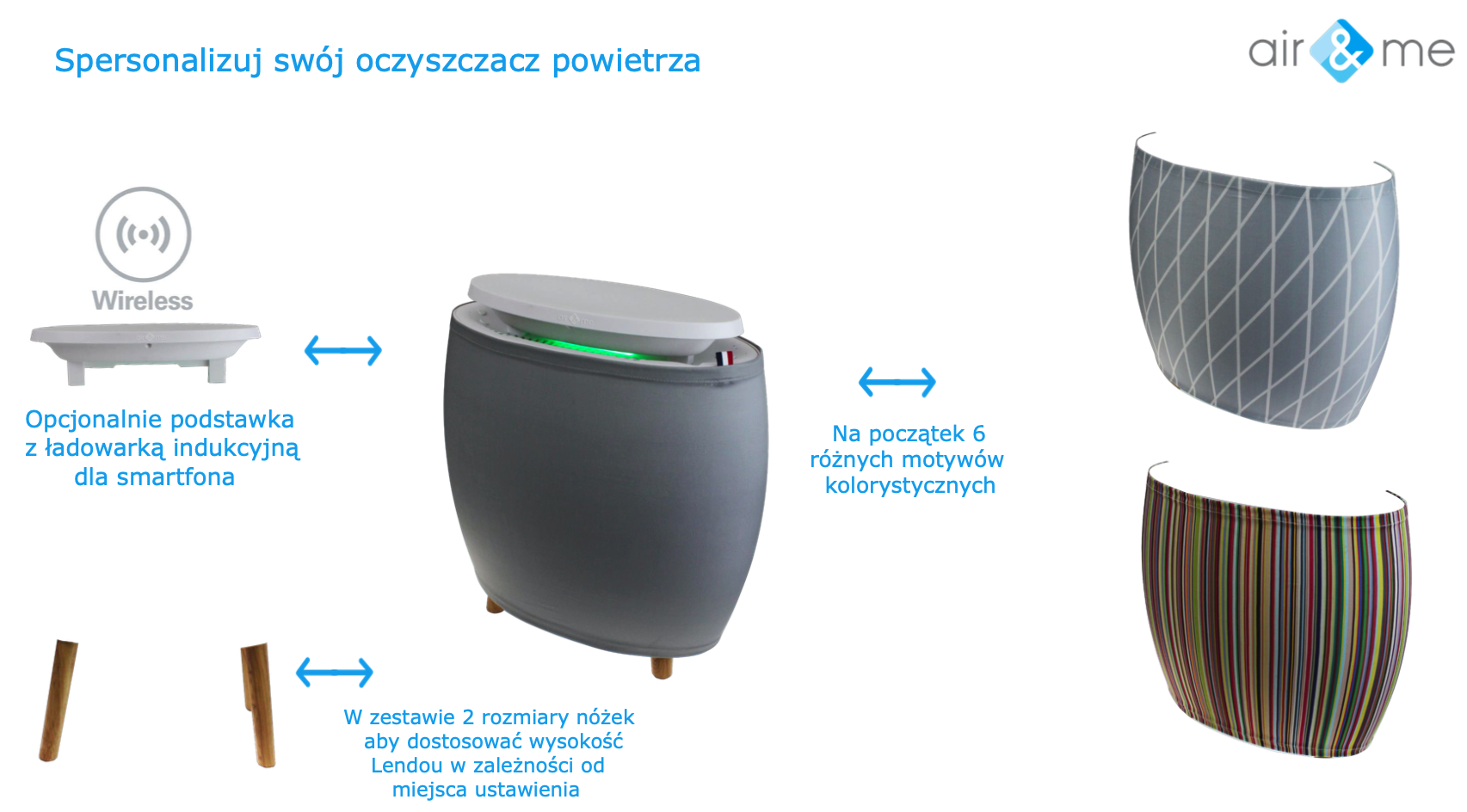 Dostępne są liczne filtry wstępne. Można je prać, a ich funkcją jest odfiltrowywanie grubszych cząstek, kurzu i sierści zwierząt. Możliwość dostosowania wysokości swojego oczyszczacz. Dostarczane są 2 zestawy nóżek do ustawienia oczyszczacza powietrza na różnych wysokościach. Dzięki temu z łatwością znajdzie swoje miejsce przy wezgłowiu lub na końcu sofy. Dostępne są wymienne spersonalizowane materiały obudowy – 6 motywów kolorystycznych do wyboru (możliwość dokupienia).