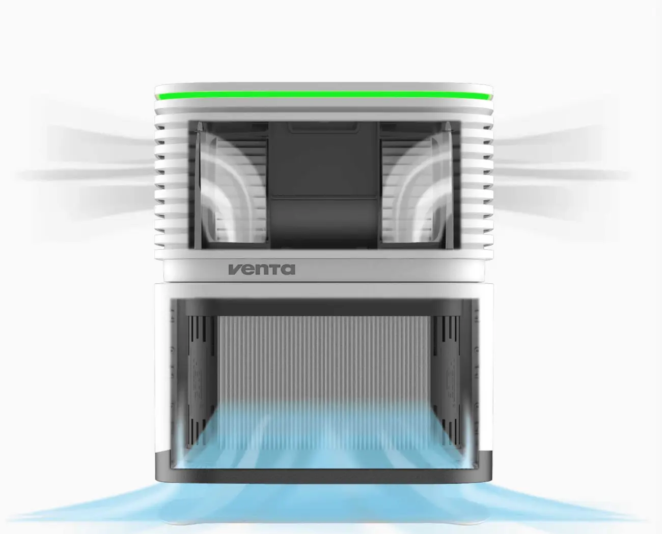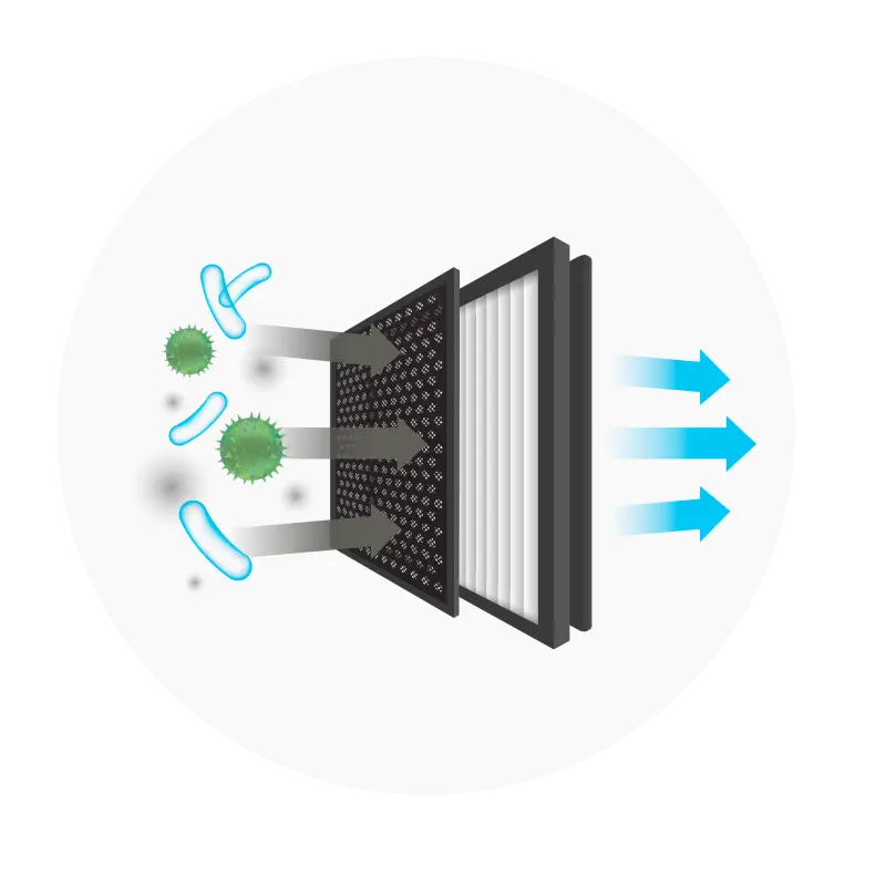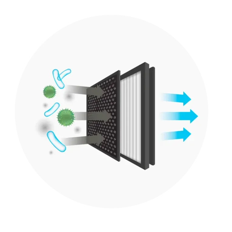 Skuteczność 99,97%: Urządzenie usuwa z powietrza nawet najmniejsze cząsteczki o wielkości do 0,3 µm, w tym alergeny, wirusy, bakterie i pyły.
