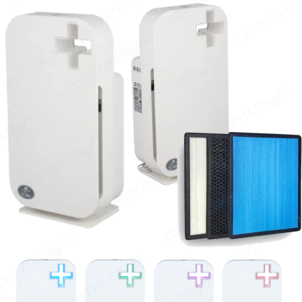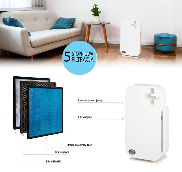 Oczyszczacz powietrza wyposażony w  filtr HEPA, węglowy, foto-katalityczny TiO2 oraz jonizator jonów ujemnych. Do pomieszczeń max. 60 m2