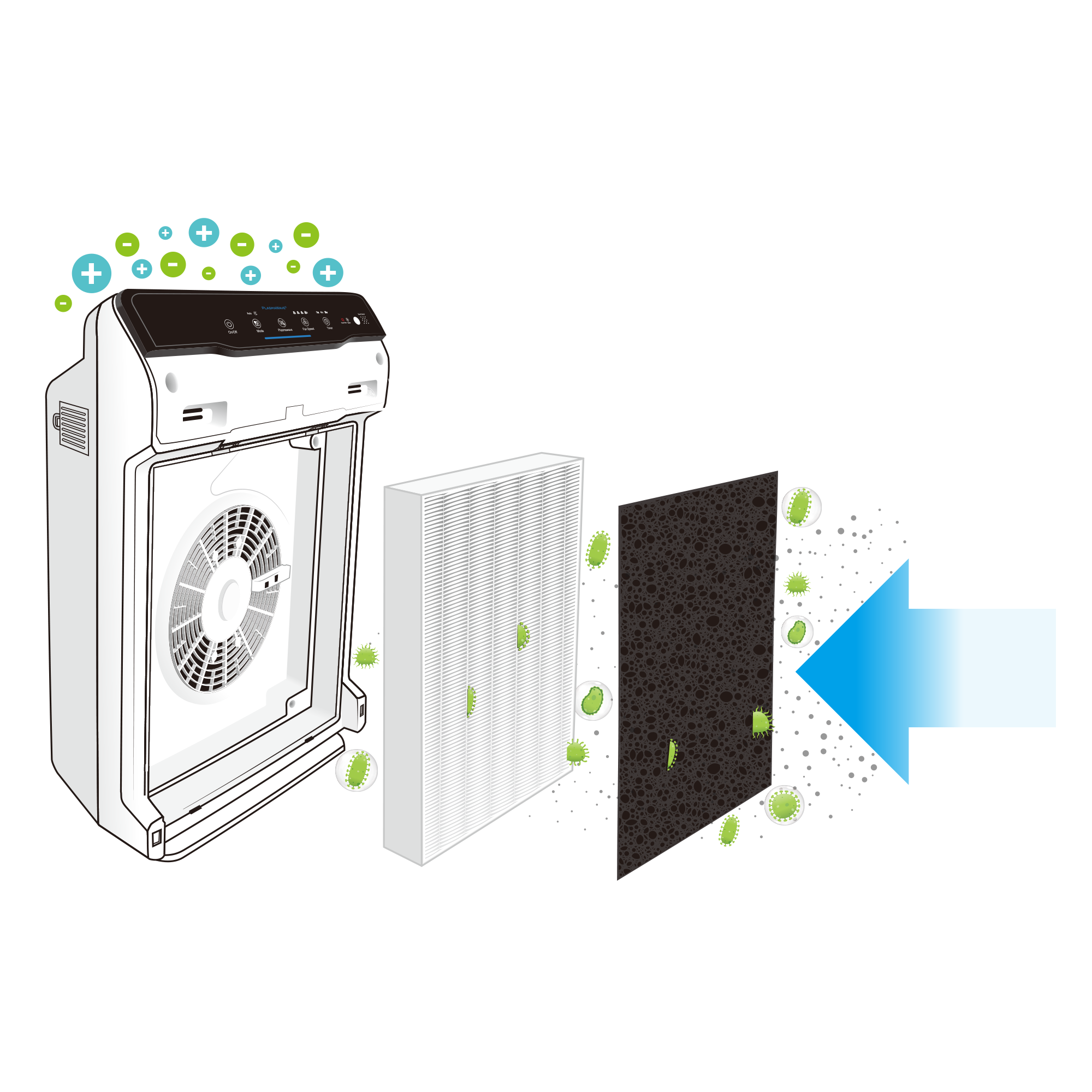 - 99.97% True HEPA Filter – filtr wyłapuje zdecydowaną większość mikrozanieczyszczeń do wielkości 0,3 µm, w tym większość wirusów, zarodków pleśni i grzybów, bakterii i pierwotniaków.