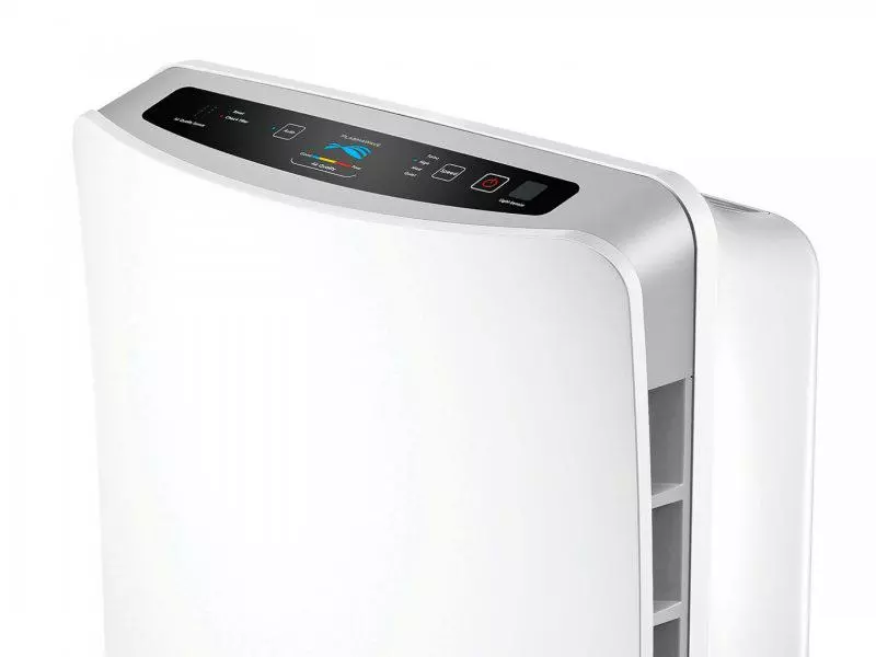 - Wymiana filtra: Urządzenie ma filtr w formie kasety, który łączy funkcje filtra wstępnego, węglowego i HEPA. Producent zaleca wymianę co 24 miesiące, a oczyszczacz sam poinformuje o tym za pomocą wskaźnika „Check filter”.