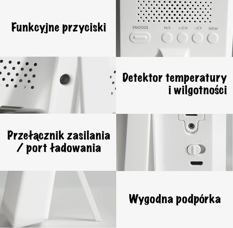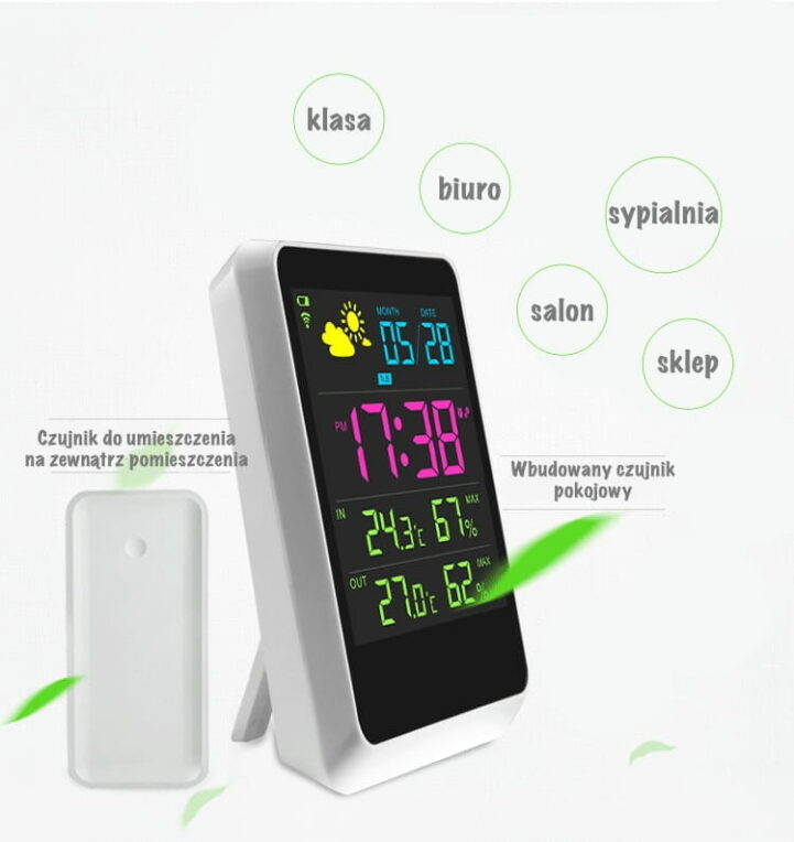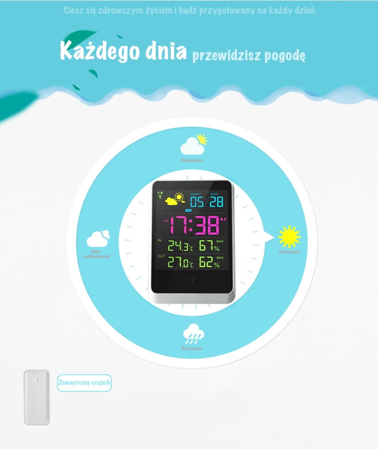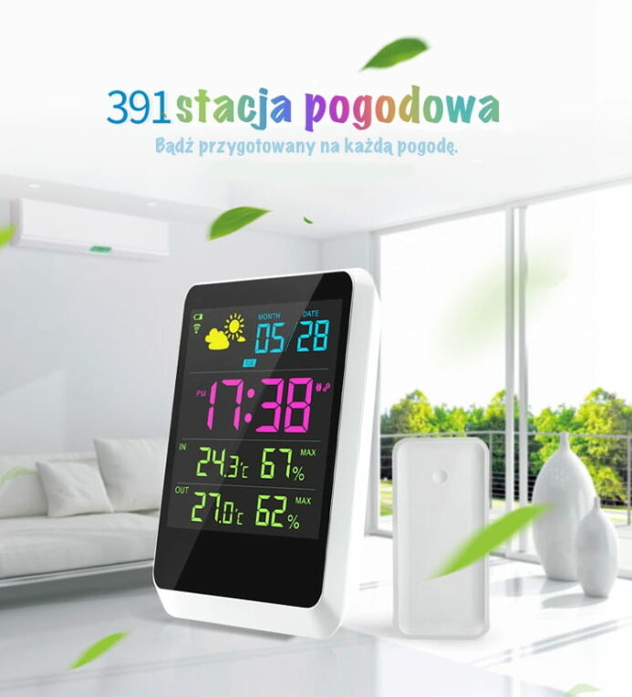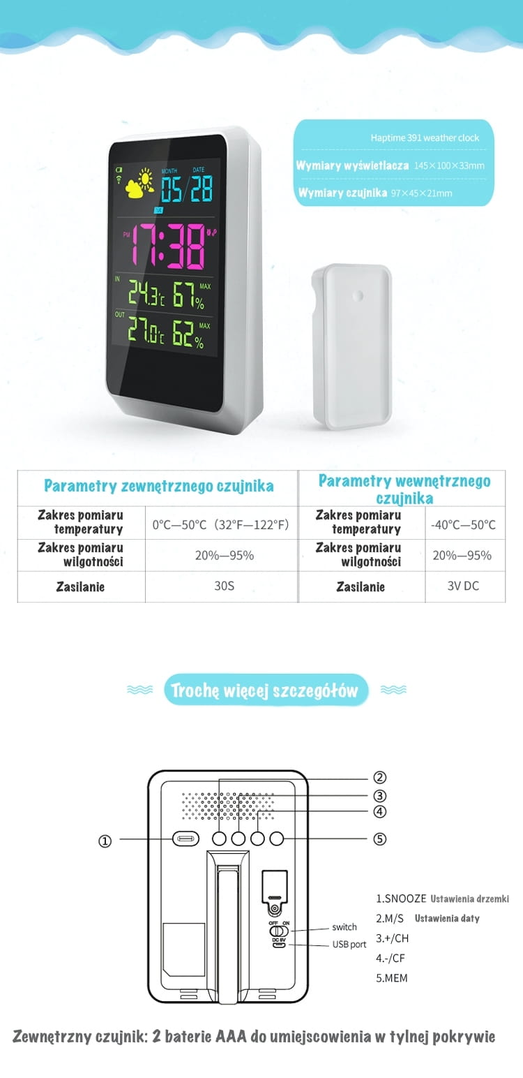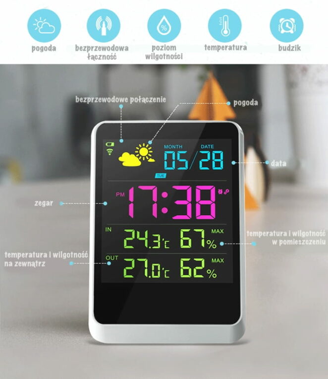 Funkcje: – prognoza pogody – monitorowanie temperatury – monitorowanie wilgotności – pomiar czasu 12/24 h – alarm/budzik, cztery dźwięki alarmu do wyboru – programowalny czas drzemki – 5-calowy wyświetlacz LCD – ekran o kącie widzenia 120 deg – sygnalizacja niskiego poziomu baterii – technologia bezprzewodowa do komunikacji stacji głównej z zewnętrznym zdalnym czujnikiem