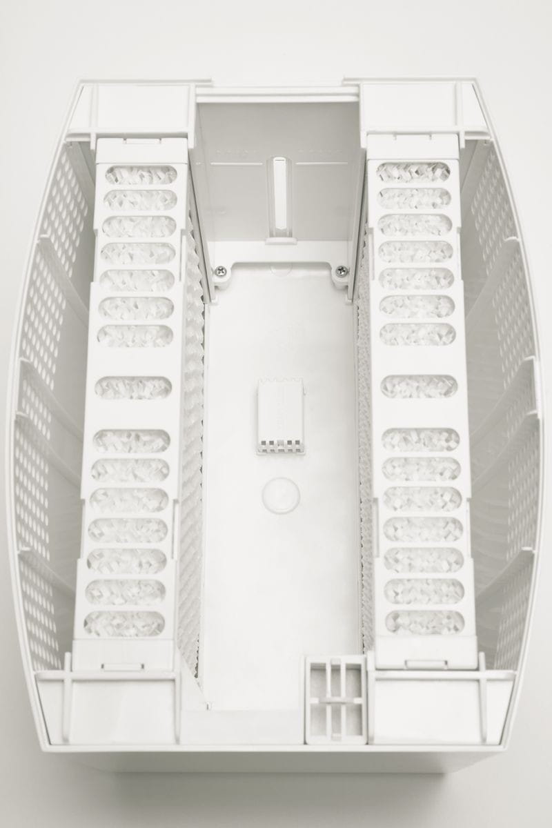 W nawilżaczu Helos znajduje się zbiornik na wodę, w którym są umieszczona jest kaseta z matami nawilżającymi. Czysta woda z oczyszczacza za pomocą wentylatora jest rozprowadzana w pomieszczeniu.