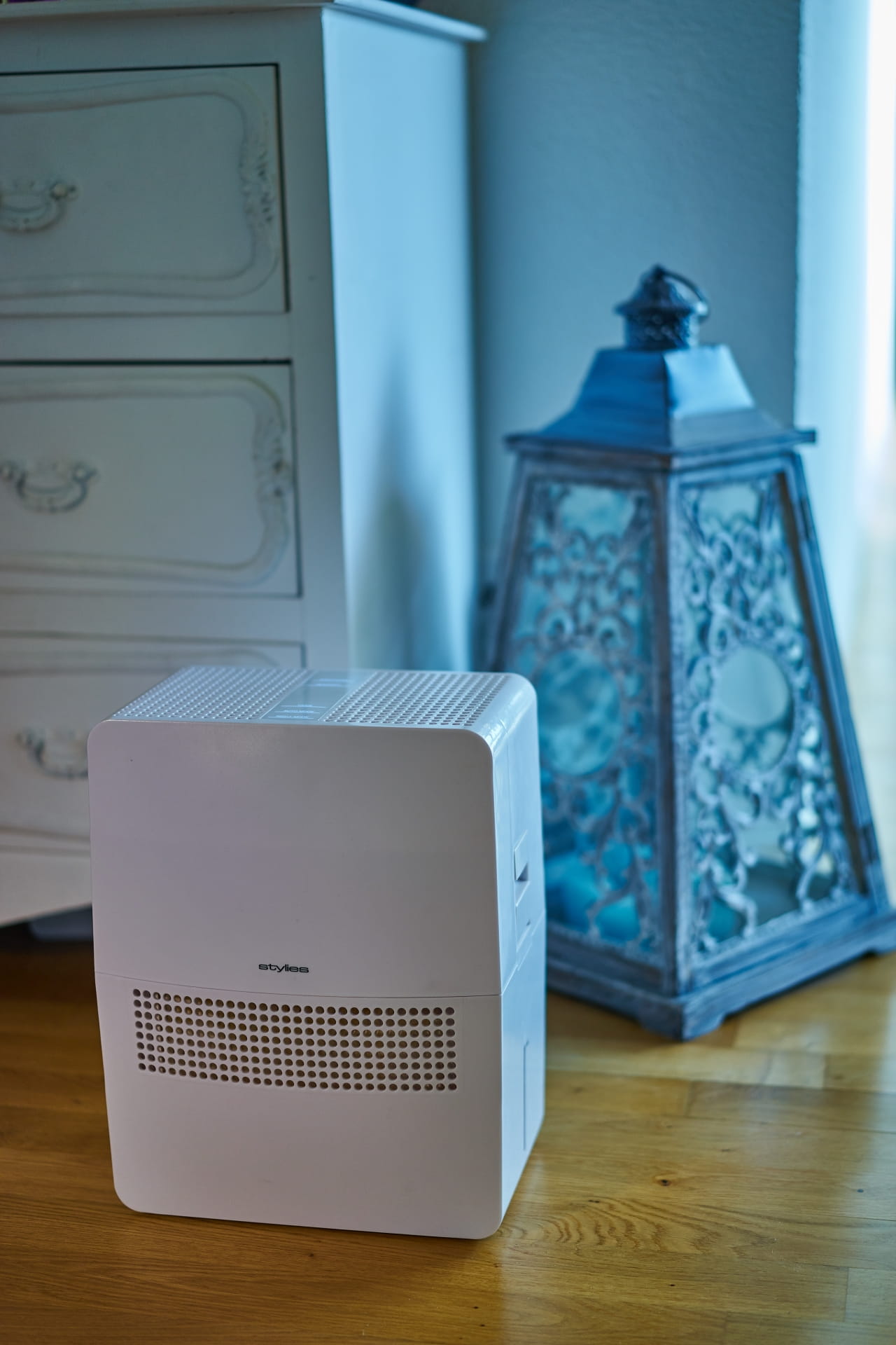 Nawilżacz ewaporacyjny Helos szwajcarskiej marki Stylies z matami nawilżającymi oraz zabezpieczeniem przed namnażaniem się mikroorganizmów (system Clean Cube), szufladką na olejki zapachowe oraz zintegrowanym higrostatem. Doskonały do sypialni i pokoju dziecięcego.