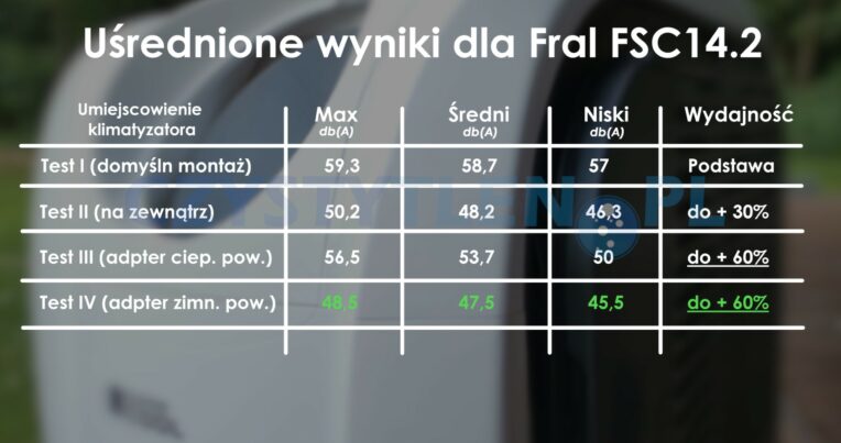 Tabla z podsumowaniem testu głośności klimatyzatora Fral FSC 14.2 / (Wi-Fi)