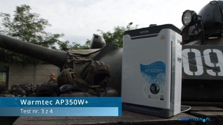 b) Warmtec AP350W+ odstaje w drugą stronę i on jest, można powiedzieć, na samym końcu, mimo że miernik jakości powietrza nie pokazywał nam maksymalnego zagrożenia. W tym przypadku czołgu nie przepakowaliśmy, stał niedaleko namiotu w związku z czym dochodziło do niego jeszcze więcej zanieczyszczeń.