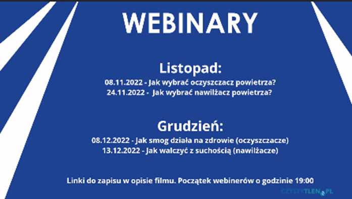 Webinary odnośnie nie tylko oczyszczaczy powietrza, ale też i nawilżaczy powietrza. Będziemy poruszali tematykę zanieczyszczeń, które są w Polsce, będziemy rozmawiali raz o oczyszczaczach raz o nawilżaczach powietrza. Czasami będziemy łączyli te tematy, jeden i drugi. I będziesz mógł na żywo zadzwonić, zadać mi pytania.