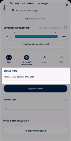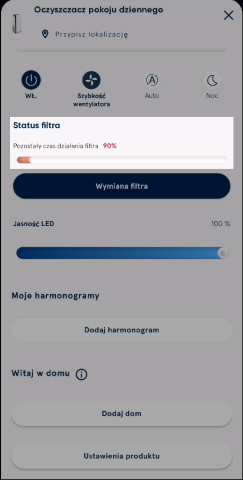 – Posiada wskaźnik zużycia filtra (po 5 min. takiego intensywnego oczyszczania, wskaźnik jakości filtra z 99 % spada o 9%, co wykrywa aplikacja oczyszczacza).