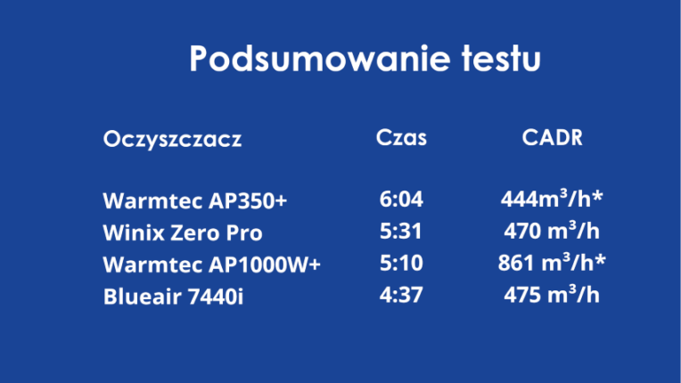 Blueair wyprzedził wszystkie te oczyszczacze, ale nie z tego powodu, że faktycznie ma lepszy CADR niż deklaruje producent. Ale po prostu nie udało nam się aż tak bardzo zanieczyścić tego powietrza, bo w którymś momencie po prostu rura doprowadzająca spaliny do namiotu uległa stopieniu.